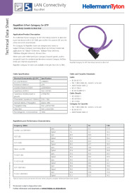 | Technical Description | The RapidNet Category 5e UTP solution is designed using U-UTP cable loosely bundled in a 5 round 1 configuration which maintains performance and reduces alien crosstalk. The Short Body cassette is 32mm long and is manufactured with a simple push clip mechanism and polarising pips to prevent incorrect insertion. Rear cable management is provided within the RapidNet Short Body Cassette with integral strain relief which provides protection to all the cables and their terminations. All RapidNet terminations are tested to exceed all ISO/EIA 11801:2002 1.1 and ANSI/TIA/EIA 568-C Category 5e standards. All RapidNet Category 5e cables are made with LS0H material, complying with the latest European fire ratings. NB: Part Numbers given are for 10m looms in the standard 5 colours Black(BK), Blue(BL), Green(GN), Red(RD) and Yellow(YE). Lengths are available from 10m to 90m in 0.5m increments. *An additional 7 colour options are available on request, contact HellermannTyton Sales Desk for further details. |